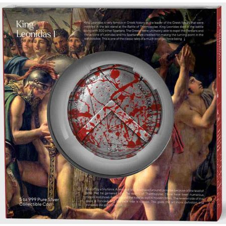 La moneda en cuestión, presenta el reverso cóncavo y el anverso convexo, simulando el clásico escudo del ejercito espartano; y dándole un aspecto realmente especial. Para completar el diseño la moneda tiene un acabado espectacular con una salpicadura de pintura rojo sangre en ambos lados para enfatizar las duras batallas que ocurrieron durante esos tiempos.